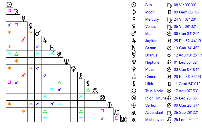 | Mercury | 24 Virgo 8 | 28 Leo 23 | 0 Capricorn 23 |