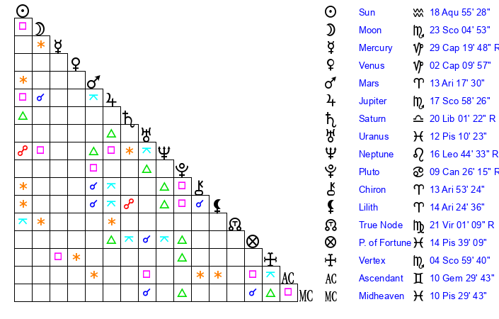 | Jupiter | 17 Scorpio 43 | 11 Gemini 18 | 11 Scorpio 46 |