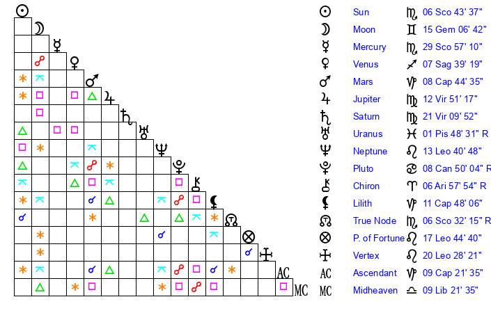| Moon | 14 Gemini 53 | 16 Aquarius 26 | 13 Aries 10 |