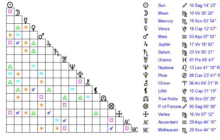 | Saturn | 24 Virgo 30 | 25 Pisces 5 | 21 Virgo 47 |