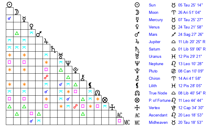 | Moon | 26 Aries 55 | 17 Aries 16 | 11 Aquarius 32 |