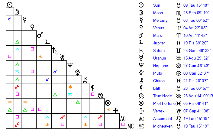 | Moon | 25 Scorpio 7 | 21 Gemini 21 | 2 Sagittarius 45 |