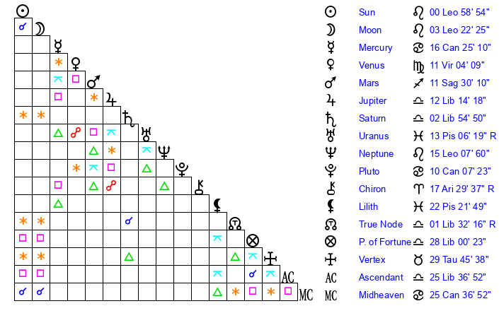 | Sun | 0 Leo 59 | 2 Leo 3 | 11 Scorpio 30 |