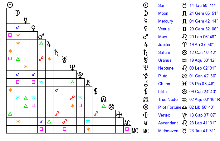 | Moon | 24 Gemini 3 | 28 Leo 42 | 23 Gemini 30 |