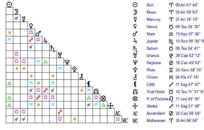 | Sun | 9 Aries 52 | 11 Aries 14 | 29 Cancer 42 |