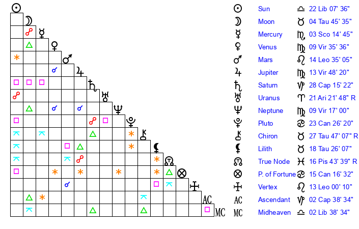 | Sun | 22 Libra 7 | 22 Libra 35 | 26 Capricorn 8 |