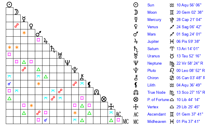 | Moon | 20 Gemini 15 | 10 Pisces 40 | 19 Leo 8 |