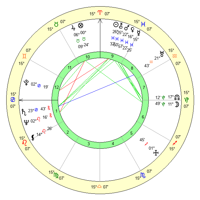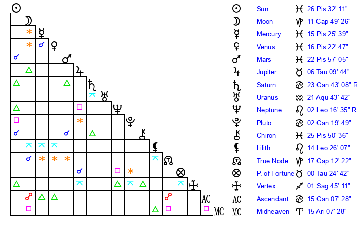 | Sun | 26 Pisces 32 | 27 Pisces 21 | 11 Cancer 9 |