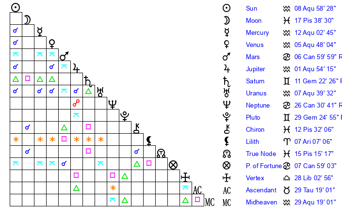| Moon | 17 Pisces 35 | 12 Aquarius 20 | 10 Aries 17 |