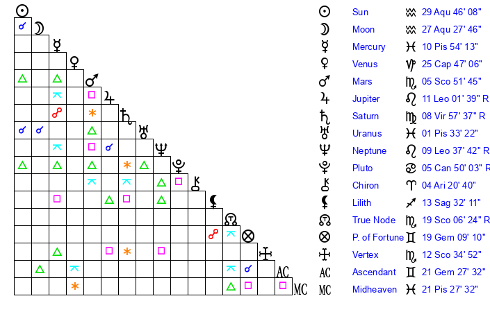 | Moon | 27 Aquarius 29 | 19 Scorpio 53 | 4 Capricorn 21 |