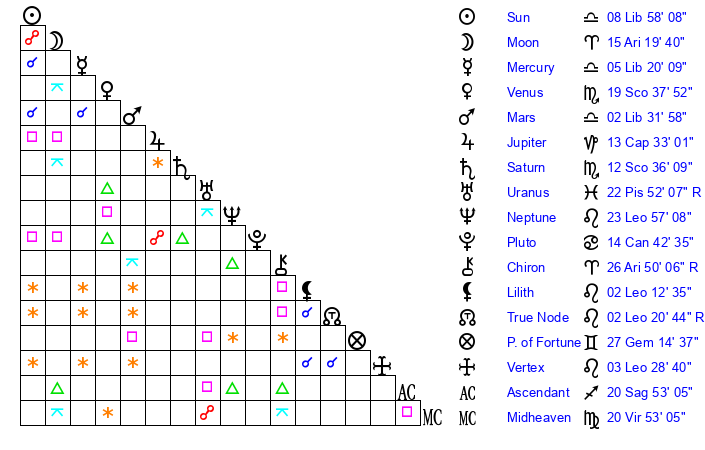 | Moon | 15 Aries 20 | 11 Aquarius 25 | 1 Sagittarius 9 |