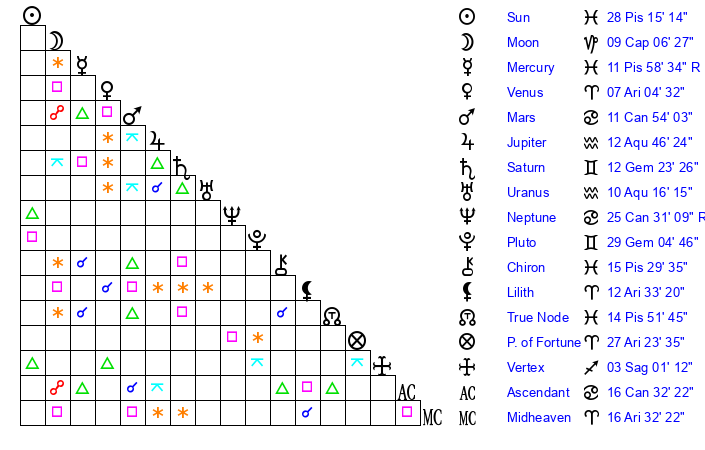 | Mercury | 11 Pisces 58 | 8 Aries 17 | 28 Cancer 0 |