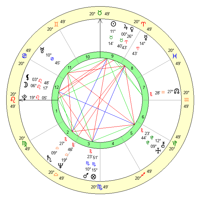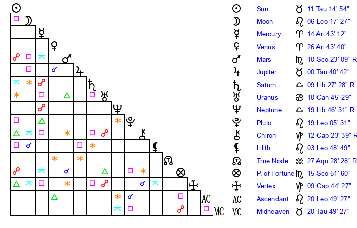 | Pluto | 19 Leo 5 | 3 Aquarius 48 | 20 Leo 15 |