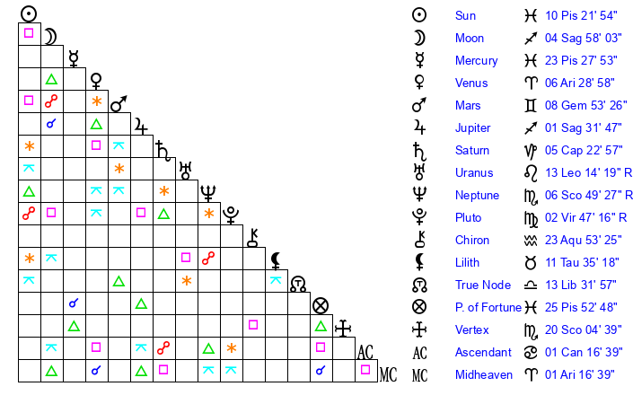 | Sun | 10 Pisces 22 | 11 Pisces 22 | 15 Taurus 25 |