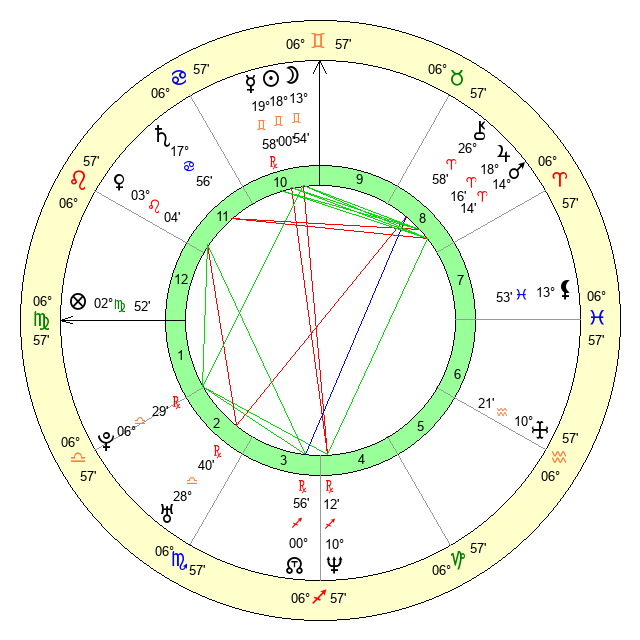 | Moon | 14 Gemini 0 | 28 Scorpio 2 | 14 Aries 32 |