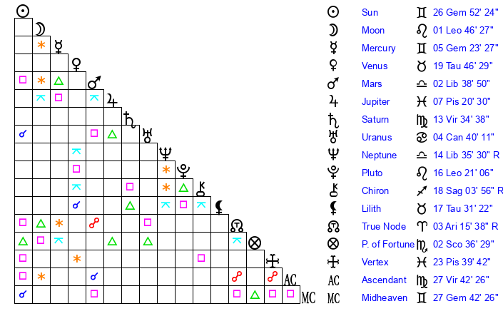 | Sun | 26 Gemini 52 | 27 Gemini 42 | 8 Virgo 40 |