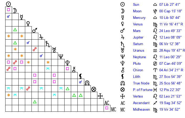 | Sun | 7 Libra 27 | 8 Libra 46 | 24 Capricorn 16 |