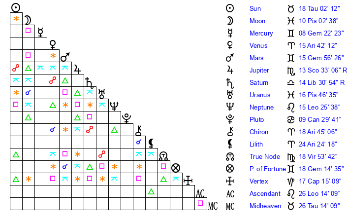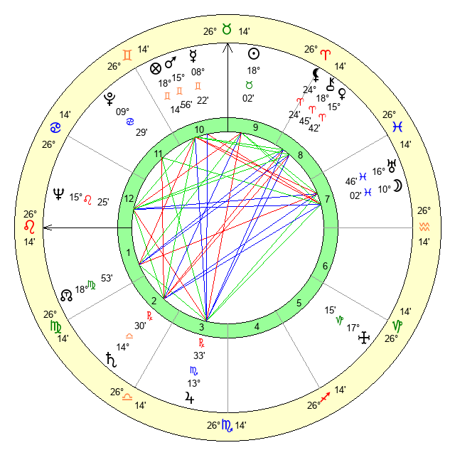| Moon | 10 Pisces 2 | 16 Libra 39 | 1 Sagittarius 38 |