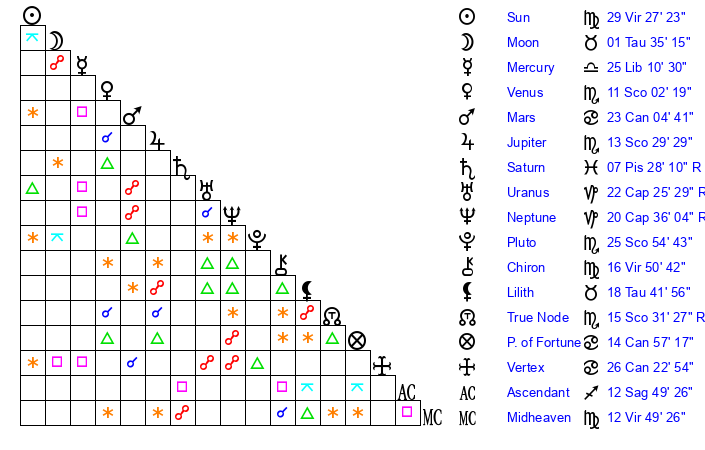 Moon | 1 Taurus 34 | 9 Libra 47 | 15 Gemini 29 |