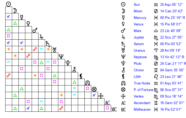 | Mercury | 0 Pisces 24 | 0 Pisces 23 | 12 Gemini 44 |