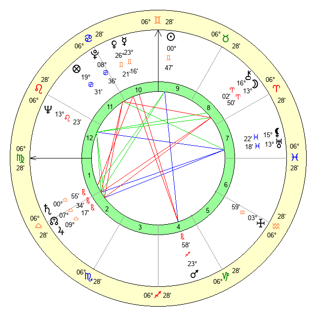 | Sun | 0 Gemini 48 | 1 Gemini 51 | 9 Virgo 25 |