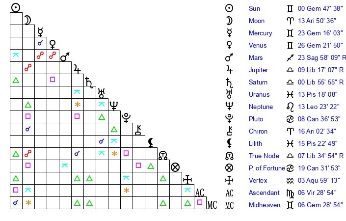 | Venus | 26 Gemini 22 | 16 Aries 20 | 25 Libra 15 |