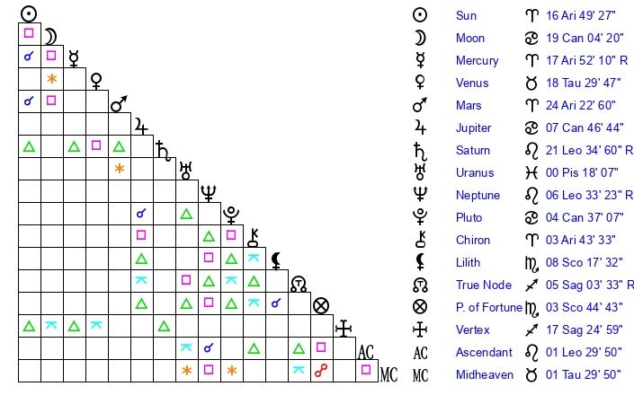 | Moon | 19 Cancer 8 | 19 Leo 20 | 28 Taurus 32 |