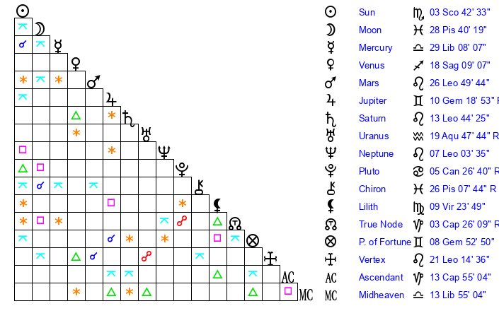| Saturn | 14 Leo 27 | 25 Pisces 54 | 10 Leo 56 |