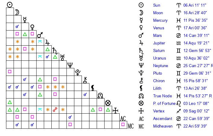 | Sun | 6 Aries 11 | 7 Aries 16 | 23 Cancer 17 |