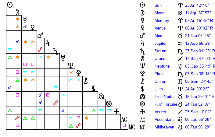 Jupiter | 12 Aquarius 55 | 18 Gemini 6 | 16 Aquarius 42 |