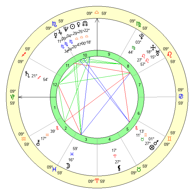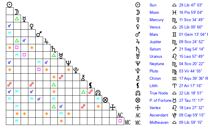 | Moon | 17 Pisces 1 | 24 Scorpio 27 | 20 Leo 3 |