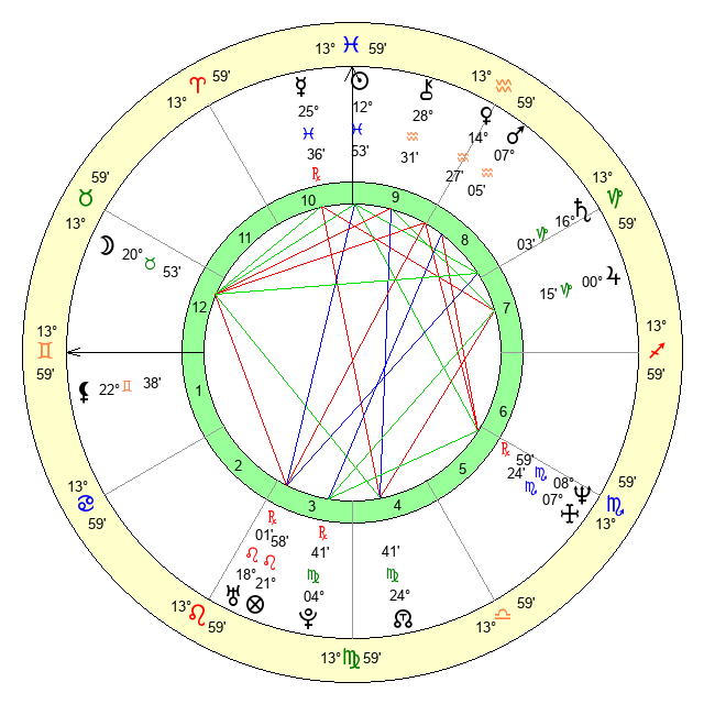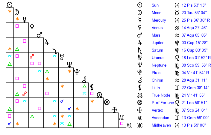 | Sun | 12 Pisces 53 | 13 Pisces 7 | 16 Taurus 52 |