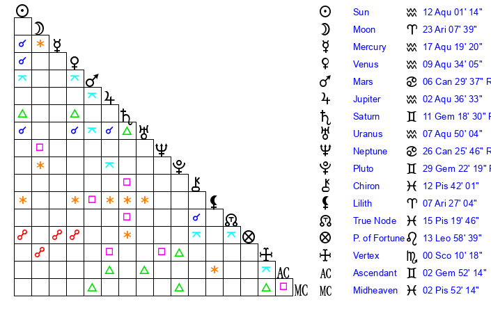 | Sun | 12 Aquarius 1 | 13 Aquarius 5 | 1 Gemini 42 |
