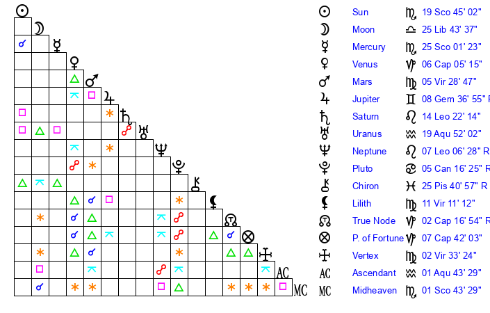 | Moon | 25 Libra 45 | 26 Leo 17 | 9 Libra 51 |