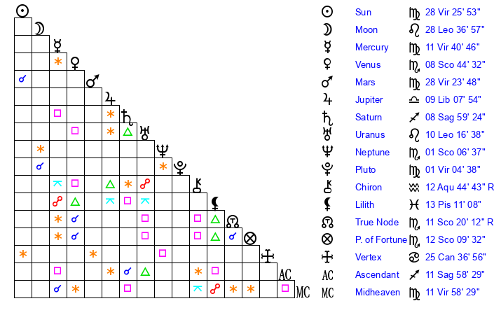 | Sun | 28 Virgo 26 | 28 Virgo 58 | 6 Sagittarius 12 |