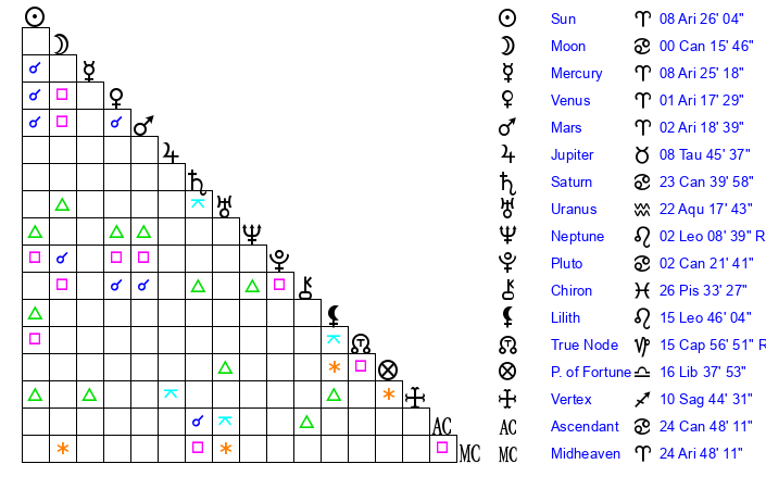 | Sun | 8 Aries 26 | 9 Aries 15 | 22 Cancer 35 |