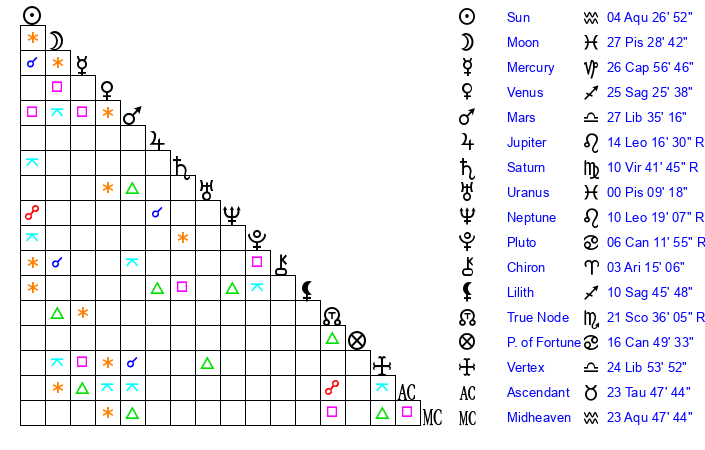 | Neptune | 10 Leo 18 | 27 Pisces 47 | 8 Leo 51 |
