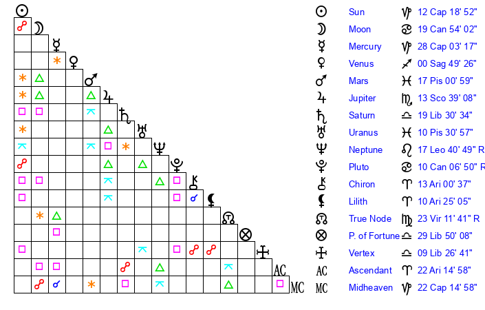 | Venus | 0 Sagittarius 49 | 12 Capricorn 37 | 18 Pisces 17 |