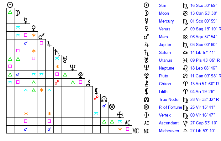 | Moon | 13 Cancer 50 | 15 Cancer 28 | 24 Aries 52 |