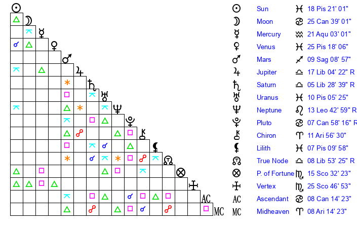 | Sun | 18 Pisces 21 | 19 Pisces 22 | 28 Gemini 33 |