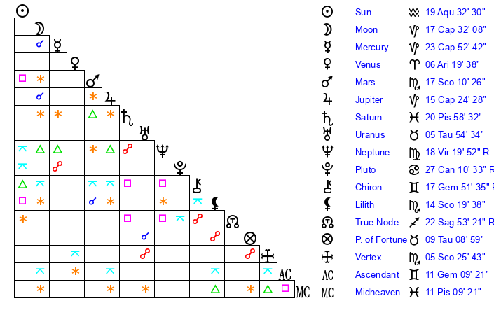 | Sun | 19 Aquarius 32 | 20 Aquarius 11 | 16 Taurus 42 |