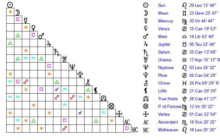 | Moon | 23 Gemini 30 | 23 Leo 4 | 19 Gemini 15 |