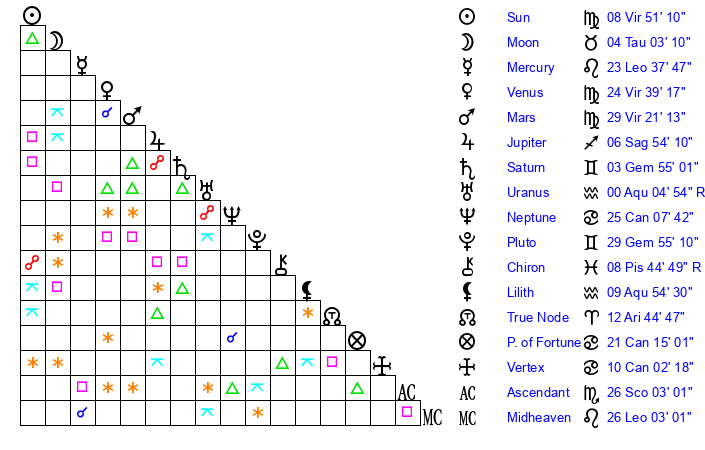 | Venus | 24 Virgo 40 | 8 Leo 24 | 12 Aquarius 54 |
