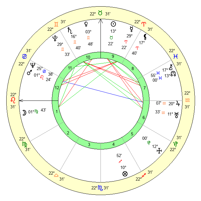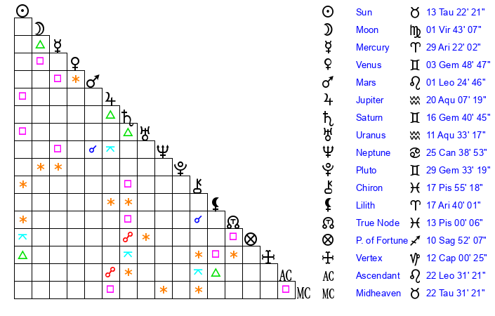 | Sun | 13 Taurus 22 | 14 Taurus 29 | 29 Leo 41 |