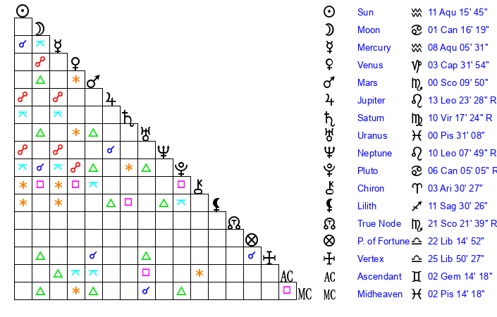 | Sun | 11 Aquarius 15 | 12 Aquarius 47 | 25 Taurus 12 |