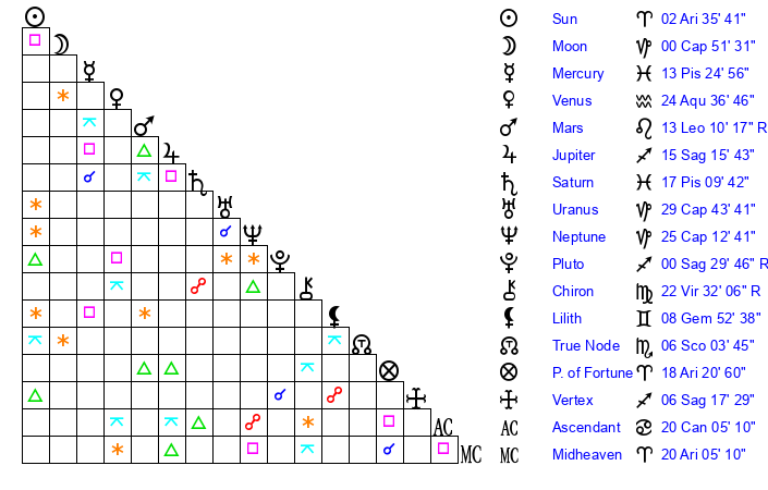 Sun | 2 Aries 35 | 3 Aries 19 | 2 Taurus 6 |