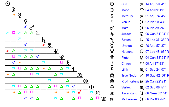 | Sun | 14 Aquarius 50 | 16 Aquarius 8 | 29 Taurus 34 |