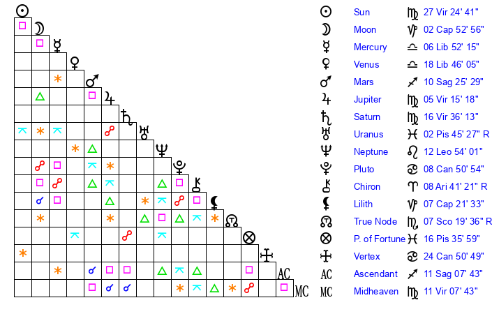| Sun | 27 Virgo 24 | 27 Virgo 59 | 12 Capricorn 48 |