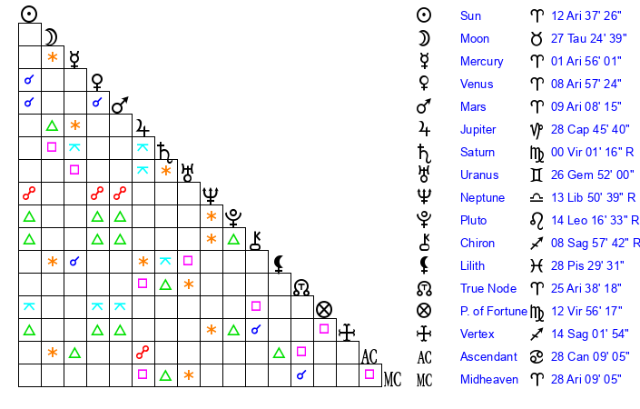 | Sun | 12 Aries 37 | 13 Aries 12 | 26 Gemini 9 |