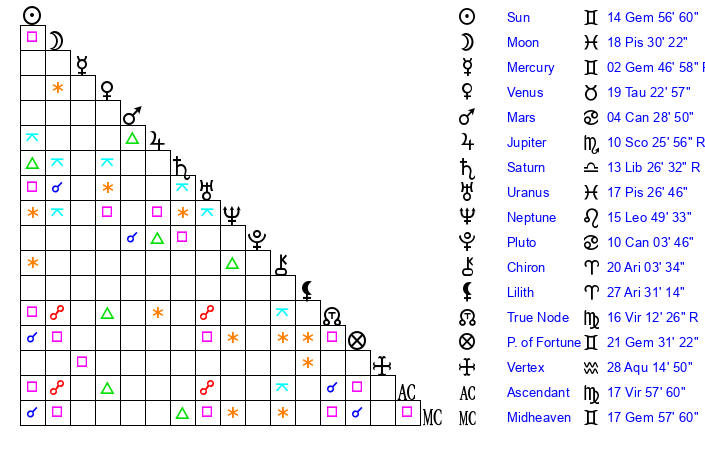 | Sun | 14 Gemini 57 | 16 Gemini 14 | 22 Virgo 47 |